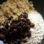 Zutaten: gehackte Mandeln, Zitronat, Orangeat, Rosinen, Rum, Mehl, Pfeilwurzelstärke, Back Hefe, neutrales Oel, Apfeldicksaft o. Zucker, Prise Salz.