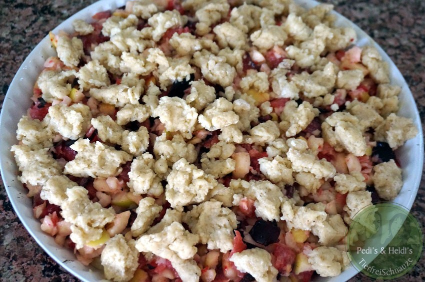 Die Apfel-Pflaumenmasse auf den Boden streichen und die Streusel darauf verteilen/darauf zupfen.