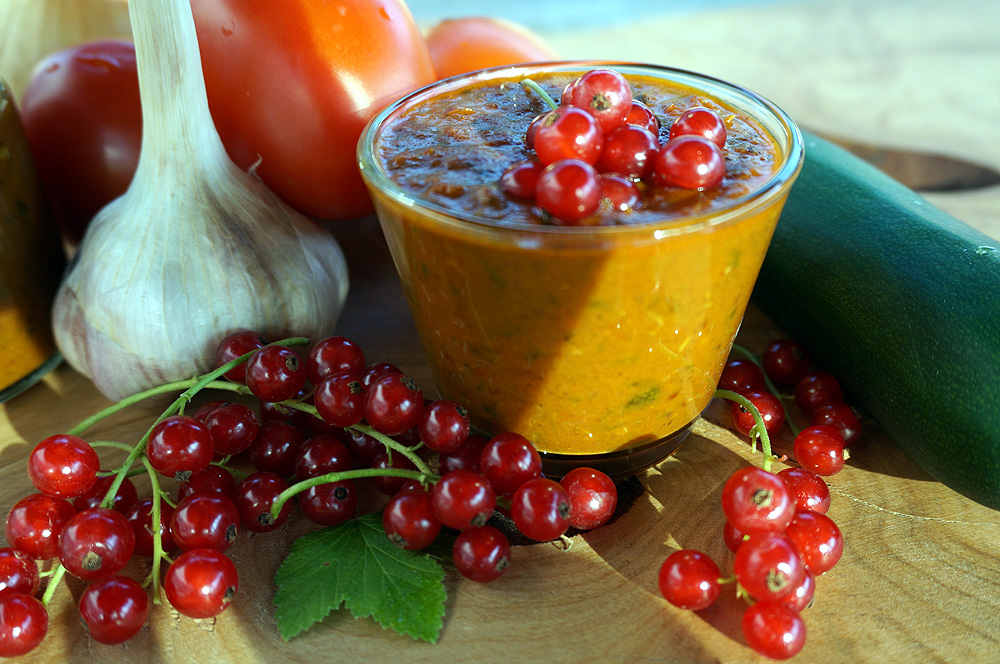 Grillzeit ist Soßenzeit….aber aus Johannisbeeren, Zucchini und Tomaten? ja genau! Da unser Erdbeer-Ketchup oder das Rhabarberketchup aus Band 2 schon so lecker schmeckt, traute ich mich, es ebenfalls mit Johannisbeeren, Zucchini und Tomaten zu probieren. Denn das ernten wir gerade im Garten bzw. gibts Alles aktuell im Handel….Kresse mag ich im Salat sehr, hatte aber noch nicht damit gekocht, daher kam auch die reichlich sprießende Kresse mit in den Topf. Ich kann mich nicht entscheiden welches Ketchup besser schmeckt…Bin sehr gespannt auf Eure Reaktionen und Eure Erfahrungen mit dieser Gartenpower! Hoffen wir dass der Sommer ewig dauert und die nächste Grillparty kann kommen.