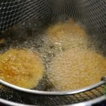 und jetzt entweder in der Pfanne mit reichlich Öl rausbraten oder in einem Frittiertopf bzw. einer Fritteuse frittieren.