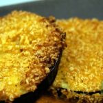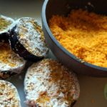 Auberginenscheiben zuerst in dem Lupinen“brei“, anschließend in den Tortilla Streuseln wälzen.