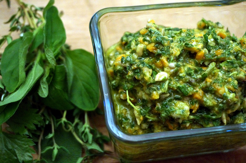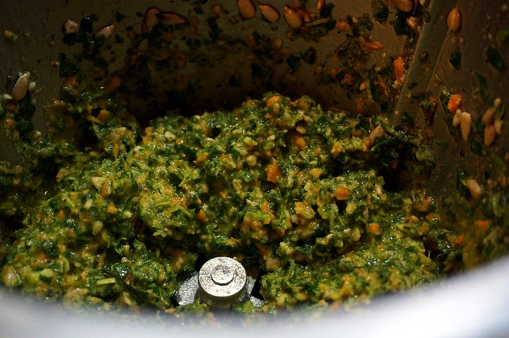 50g Walnüsse oder Pekanüsse, 50 g Hefeflocken, 1/2 bis 1 TL Salz im Mixtopf 10 Sek./ St. 10 pulverisieren – bzw. mit jedem anderen Mixgerät/ Pürierstab pulverisieren…