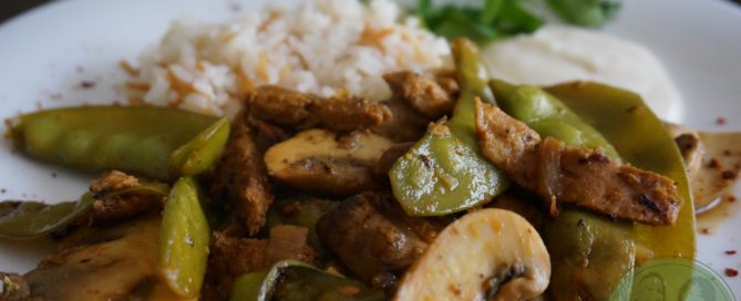 ....mit Zuckerschoten und Champignons. Ich hab das Lupinengeschnetzelte im Denn's Bioladen gekauft. Das da: Ich hab erst eine grosse Zwiebel mit 2 Zehen Knofi in Kokosöl angebruzzelt und dann das Lupinengeschnetzelte mit etwas Liquid Smoke Konzentrat [...]
