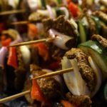 Haupt-Zutaten: Soja Rinderfilets von alles-vegetarisch.de; Schaschlik Gewürz, Liquid Smoke, Paprika, Zwiebeln, Schaschlik oder BBQ Soße, Holzspieße, Dunkles Bier; den Rest habt Ihr bestimmt daheim….