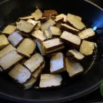 2 Pck Räuchertofu in Scheiben schneiden, halbieren und knusprig in der Pfanne anbraten, mit 2 EL Liquid Smoke ablöschen