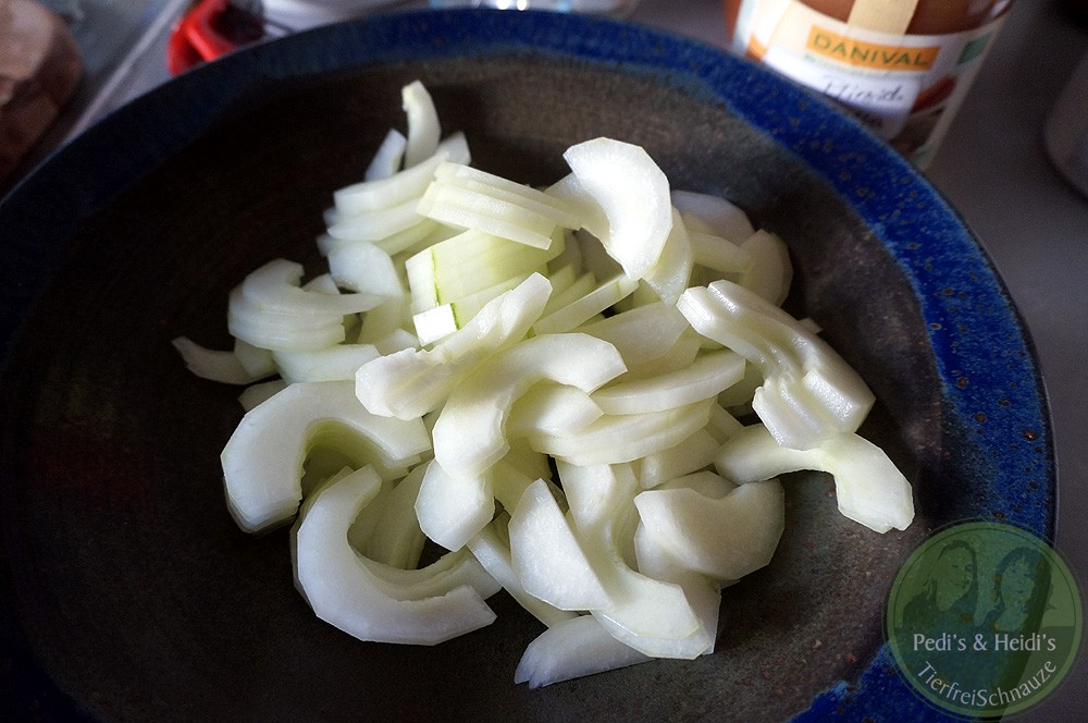 Zwiebel schälen, halbieren – ebenfalls in Scheiben schneiden