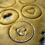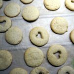 Anschließend portionsweise entnehmen; Rest im Kühlschrank lassen und auf bemehlter Oberfläche mit einem bemehlten Teigroller oder Nudelholz messerrückendick ausrollen und Plätzchen ausstechen. Dabei sollte eine Hälfte mit und die andere Hälfte ohne „Guckloch“ sein.