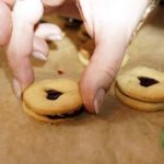 Jetzt ca 160 g Marmelade erwärmen (im TM 4 Minuten 90°, Stufe s) und je ein Plätzchen damit mittig bestreichen. Zweites Plätzchen mit Öffnung daraufsetzen. Marmelade trocknen lassen.