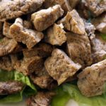 Ich weiche dieses texturierte vegane Fleisch generell so ca. 10 bis 15 Minuten in kochendes Wasser ein; als Gewürze hier Salz, Pfeffer, Paprika oder Brühgewürz verwenden; nach dem Einweichen und Abgießen der Einweichflüssigkeit habe ich direkt im Sieb mit kaltem Wasser Alles durchgespült und mit den Händen so viel Flüssigkeit wie möglich ausgedrückt. Anschließend verteilte ich es zum Trocknen auf ein Tablett und stellte es kühl – über Nacht….Nach dem „Vor-Trocknen“ habe ich beide Varianten mit Sojasoße, liquid Smoke und Oel, Grillgewürze einmariniert und ca 5 Stunden im Kühlschrank aufbewahrt. Zum Essen selber mag ich es gern wenn das vorbereitete vegane Fleisch auf frischem Salat angerichtet wird. Hier ist Eurer Kreativität keine Grenze gesetzt.